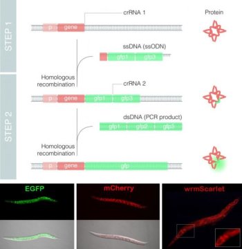 The group of Dr. Cerón at the Bellvitge Biomedical Research Institute (IDIBELL) used the model organism Caenorhabditis elegans to optimize the technique, leading to the development of the method called Nested CRISPR. This cloning-free method involves the insertion of long DNA fragments in two steps. In the first step, a small portion (less than 200 nucleotides) of the long fragment is inserted in the genome. During the second step, this small fragment then serves as a “nest” or “landing pad” for the efficient insertion of the longer fragment (of approximately one kilobase).