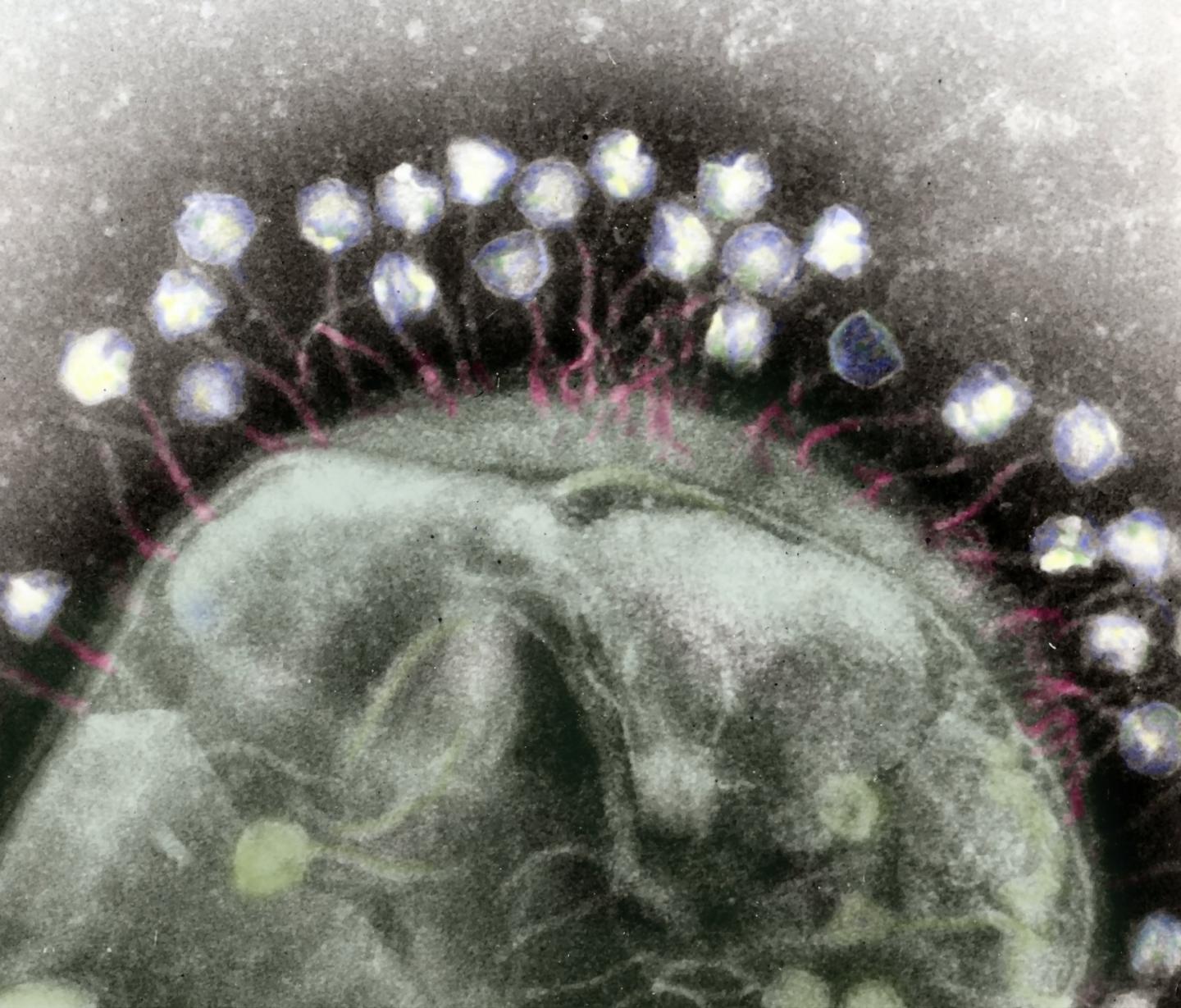 Photo: A false-color transmission electron micrograph of multiple bacteriophages attached to a bacterial cell wall