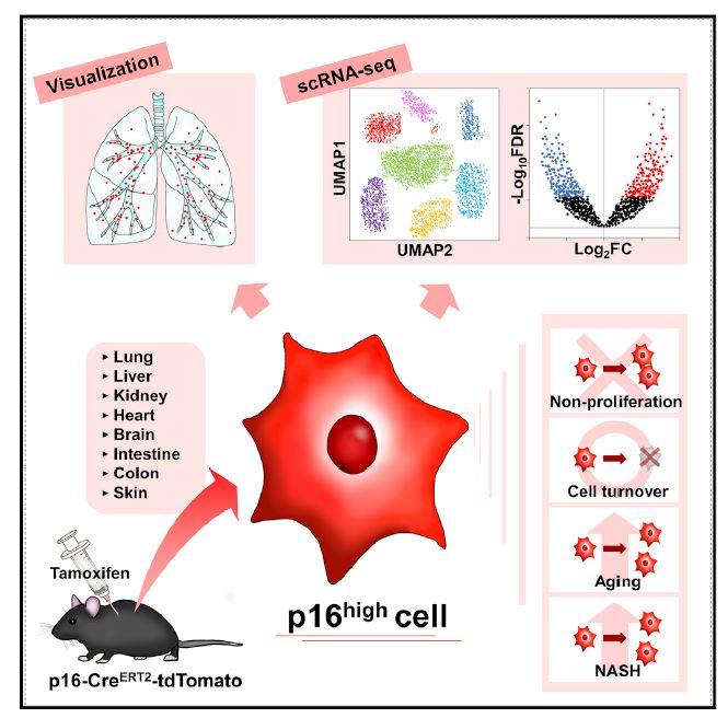 Photo: The research team generate a p16-Cre ERT2 – tdTomato mouse model to uncover the in vivo dynamics and properties of p16high cells. Single-cell RNA-seq analyses of various tissues from early…