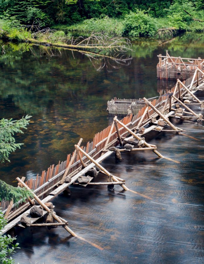 Photo: The Heiltsuk Nation’s traditional-style fish weir in the Koeye River in British Columbia, allow fishers to target specific salmon runs and enable in-season monitoring, where fishers can assess a run’s…