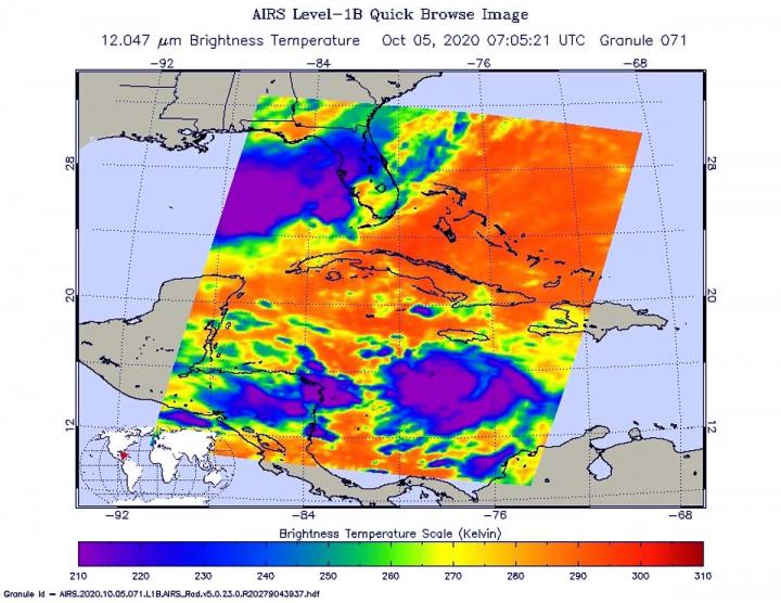 On Oct. 5 at 3:05 a.m. EDT (0705 UTC) NASA’s Aqua satellite analyzed Tropical Storm Delta using the Atmospheric Infrared Sounder or AIRS instrument. AIRS found coldest cloud top temperatures as cold as or colder than (purple) minus 63 degrees Fahrenheit (minus 53 degrees Celsius) around the center of circulation. NASA research has shown that cloud top temperatures that cold indicate strong storms that have the capability to create heavy rain.
