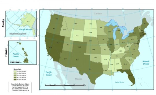 Traditionalist-heavy states also have greater proportions of hunters and anglers. The opposite is true for states with high numbers of mutualists.