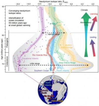 From 59 million years ago onwards, Nd-isotope signatures from the North and South Atlantic were remarkably similar. This may indicate that one deep-water mass, likely originating from the south, made its way through the Atlantic Ocean and filled the basin from deep to intermediate depths. The enhanced deep water exchange, together with increasing atmospheric CO2, may have enabled a more efficient distribution of heat over the planet.
