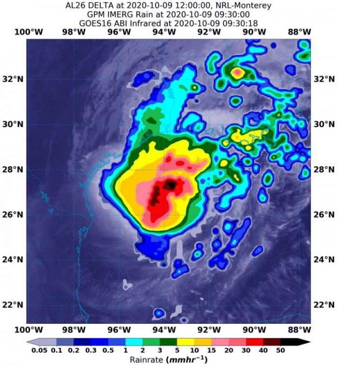 NASA’s satellite rainfall product that incorporates data from satellites and observations found that Hurricane Delta was bringing along heavy rainfall as it headed to the U.S. Gulf Coast on Oct. 9.