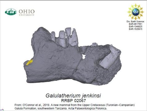The National Science Foundation-funded OHIO team, in collaboration with international colleagues, identified and named the new mammal in an article published today in Acta Paleontologica Polonica. This nearly complete lower jaw represents the first named mammal species from the Late Cretaceous Period (100-66 million years ago) of the entire African continent. The squirrel-sized animal was probably related to a group of southern hemisphere mammals known as gondwanatherians, yet a bizarre combination of features (including evergrowing and enamel-less peg-like teeth) make it challenging to easily place within any group of mammals yet known, living or extinct.