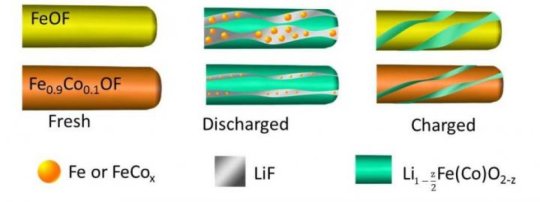 Despite FeF3’s potential to increase cathode capacity, the compound has not historically worked well in lithium-ion batteries due to three complications with its conversion reaction: poor energy efficiency (hysteresis), a slow reaction rate, and side reactions that can cause poor cycling life. To overcome these challenges, the scientists added cobalt and oxygen atoms to FeF3 nanorods through a process called chemical substitution. This allowed the scientists to manipulate the reaction pathway and make it more “reversible.”