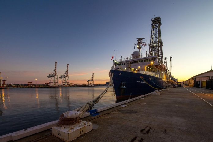 Photo: The research vessel JOIDES Resolution in Fremantle (Australia) the morning before the ship sailed on Expedition 356. The results are based on samples taken from this drilling vessel as part…