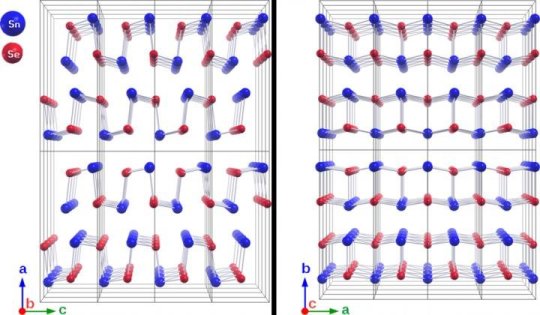 An international team led by Dr. Ulrich Schade at the HZB has now comprehensively examined samples of tin selenide with the aid of infrared spectroscopy at BESSY II and hard X-rays at PETRA IV. The measurements show that the desired crystal structure is produced by either high temperature at normal pressure or high pressure (above 10 GPa) at room temperature. The electronic properties also change from semiconducting to semi-metallic in the high-temperature structure. This fits the predictions from theoretical calculations of the model and also from band-structure calculations.
